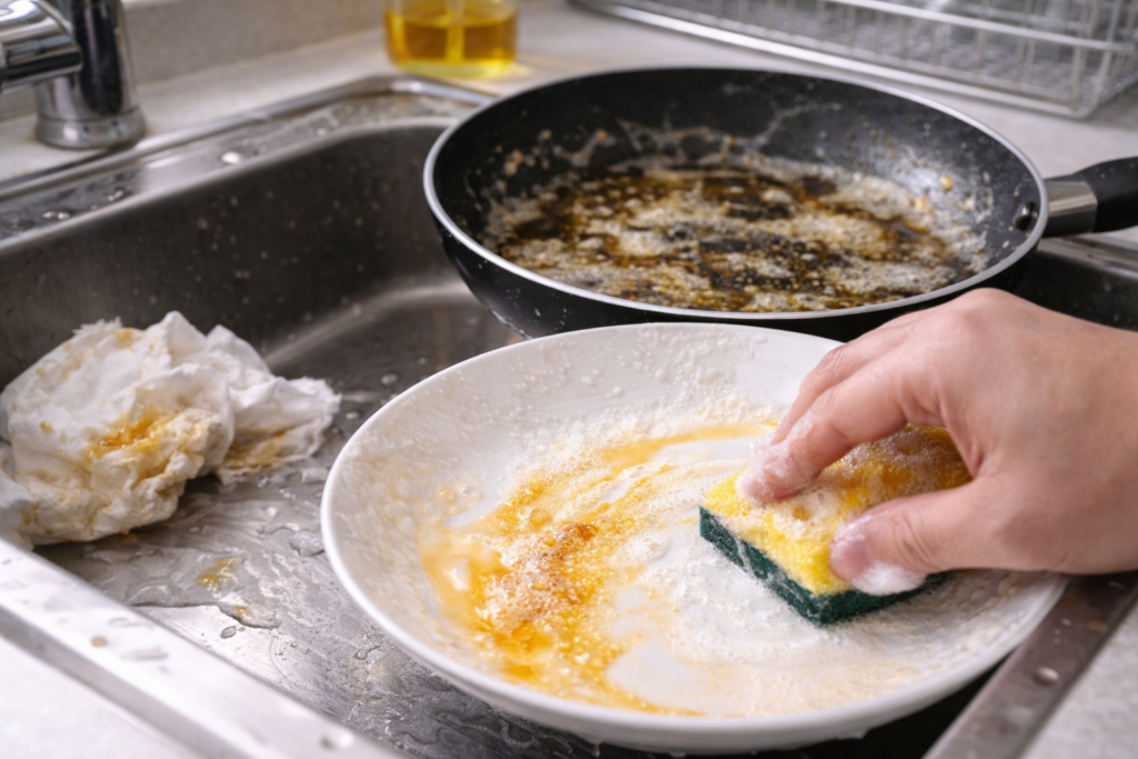 접시나 프라이팬에 기름기가 남아 있는 경우가 있습니다.