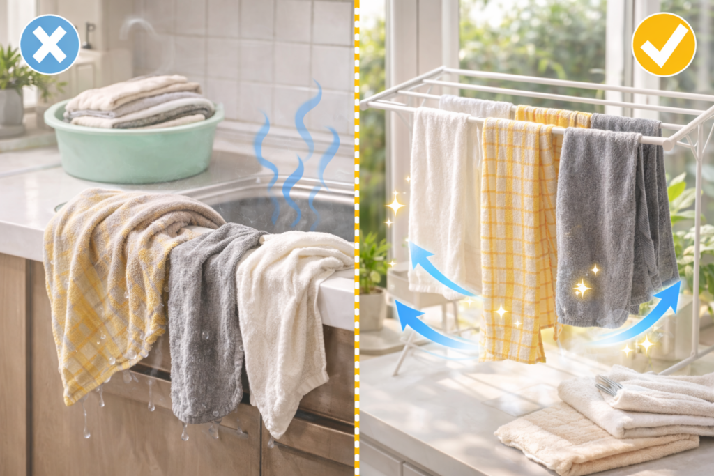 가능하다면 주방용 행주 전용 건조대를 사용하는 것도 도움이 됩니다.